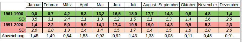 Es zeigt sich hier, dass die jährliche Temperaturerhöhung um 1 Grad sehr unterschiedlich auf die einzelnen Monate verteilt ist. Überdurchschnittlich wärmer sind die Monate Januar, Februar, April, Juli und August, während die Temperaturen im September und Oktober unverändert bleiben. Eine Erklärung hierfür ist z.Z. kaum möglich.Was immer auch die Ursachen sind, das anthropogene CO2 mit Sicherheit nicht. Zumindest müssen aber wohl weitere Faktoren, wie z.B die Entwicklung der Sonnenscheindauer (siehe Sommer 2018!) in die Bewertung der Temperaturentwicklung aber auch auf die allgemeine Wetterentwicklung einbezogen werden. Abb.10 Temperatur-Monatswerte der Jahre 1961-2020 ![]() Von besonderem